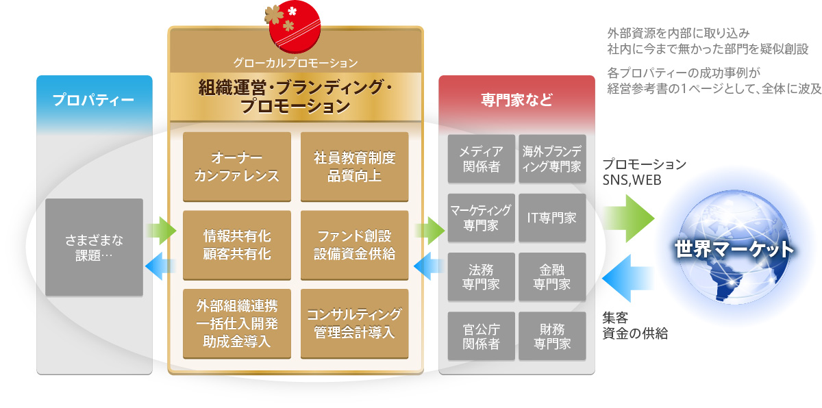 温泉ジャーナリストやカメラマンなどのメディア関係者、ITやマーケティング、ブランディング、法務、財務、知財など、幅広い分野の専門家を派遣し、宿泊施設固有の経営課題を解決致します。